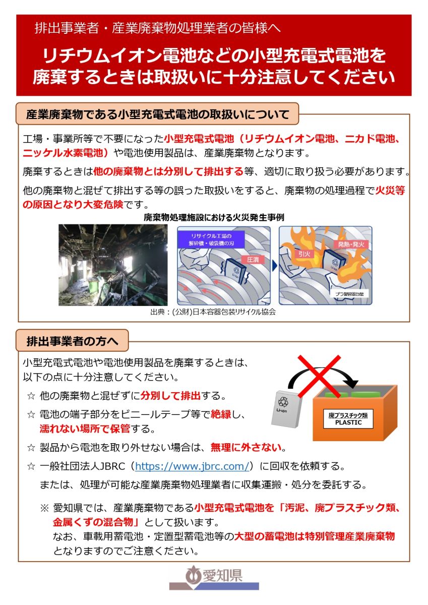 このページでは愛知県の例をご紹介していますが、リチウムイオン電池などを安全に処分するための考え方は、全国共通で大切なことです。