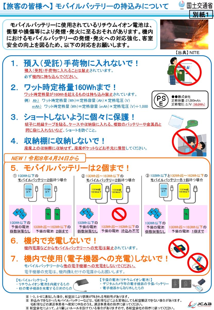 このたび、機内へのモバイルバッテリー持ち込みに関して、国土交通省より新たなルールが追加され、2026年4月24日から適用されます。