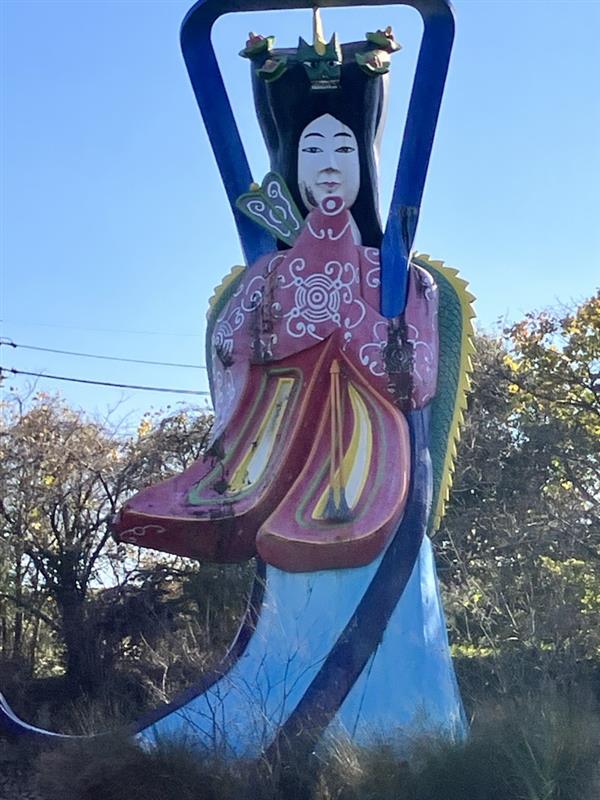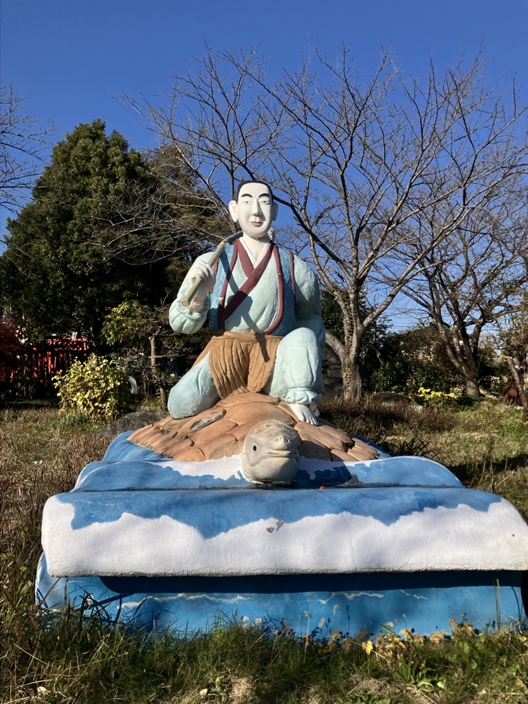 輪之内町には、地域に伝わる竜宮伝説をもとに整備された「乙姫公園」があります。園内には高さ十メートルを超える乙姫像や浦島太郎、動物たちの像が点在し、まるで物語の世界を歩いているかのような不思議な雰囲気が漂います。