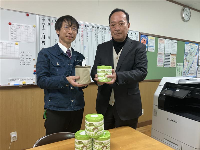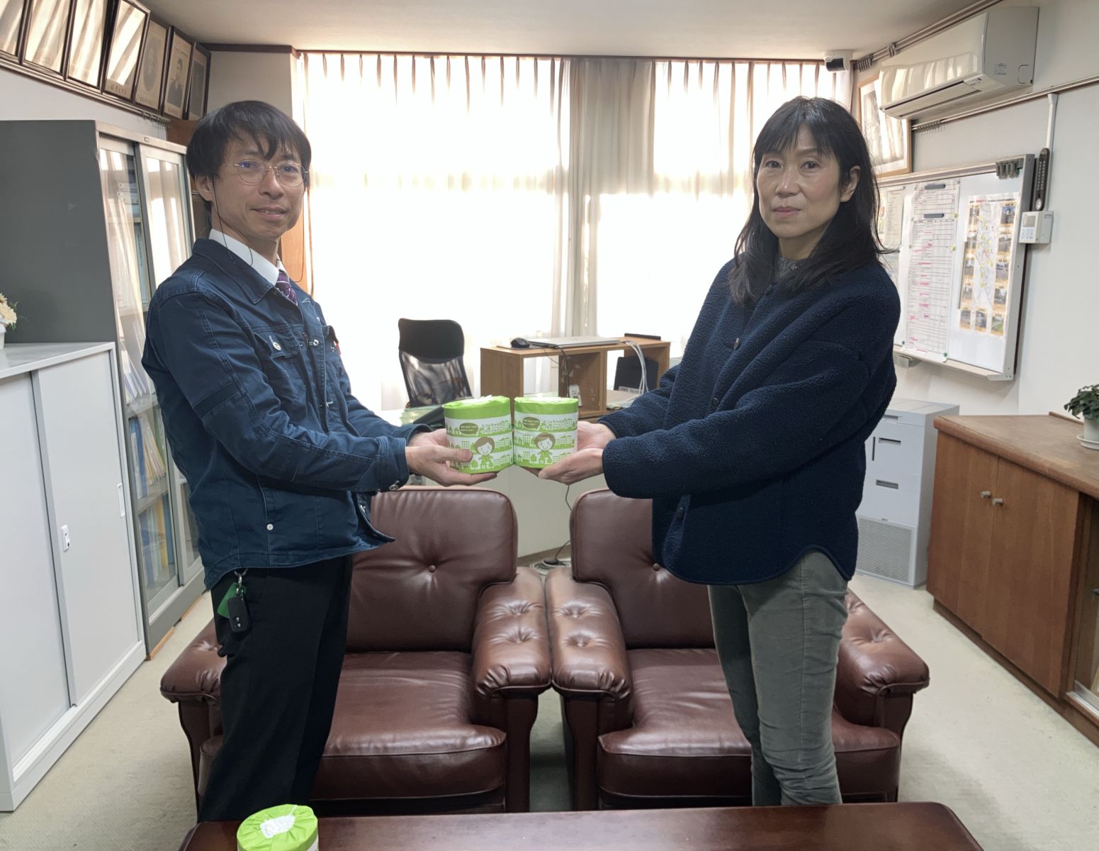 今回寄贈したリサイクルペーパーは、資源回収で集めた古紙や、事業活動の中で発生した古紙を当社で回収・再資源化した、古紙100%のリサイクルトイレットペーパーです。